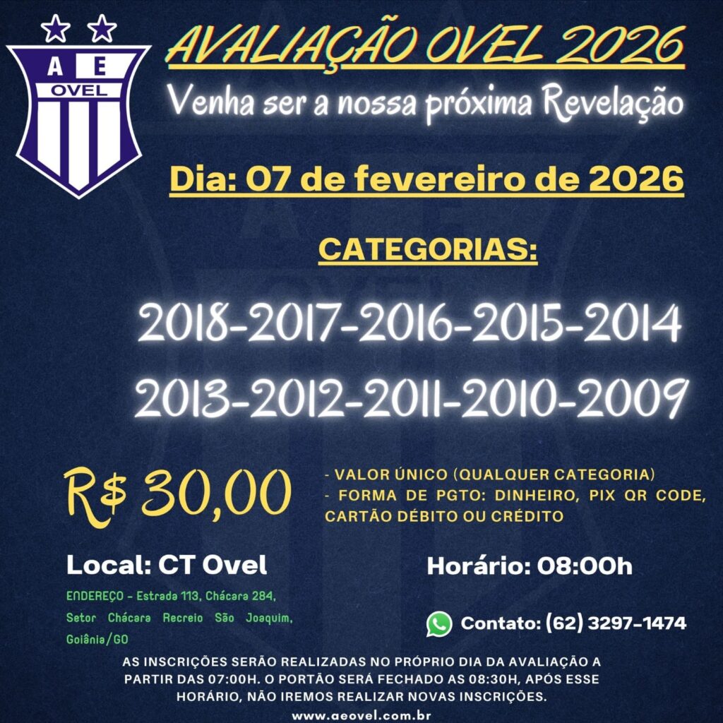 PENEIRA OVEL 2026 Seguem todas as informações sobre a Avaliação Ovel 2026: ⚽💙 📅 Data: 07 de fevereiro de 2026⏰ Horário: A partir das 08h00➡️ O portão fecha às 08h30. Após esse horário, não realizaremos novas inscrições. 🧒 Categorias:Atletas nascidos em 2009, 2010, 2011, 2012, 2013, 2014, 2015, 2016, 2017 e 2018. 📍 Local:CT Ovel […]